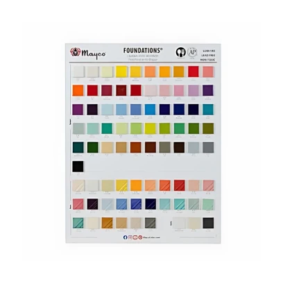 Wzornik jest dedykowany serii Mayco Foundations i nie obejmuje kolorów innych linii farb Mayco. Najlepsze odwzorowanie próbek uzyskuje się przy ekspozycji w warunkach stałego, dziennego oświetlenia.